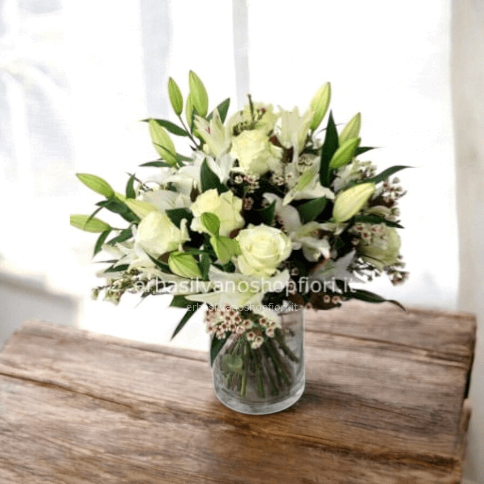 | mazzo alto di Lilium e rose bianche e gypsophila Cod. 41142 |