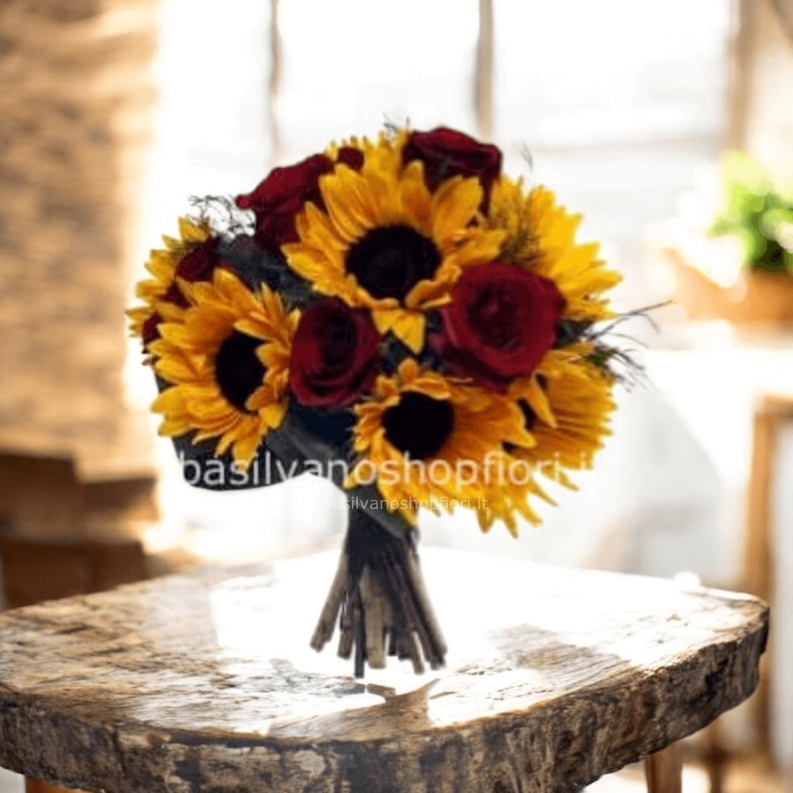 | Mazzo alto di girasoli e rose rosse Cod. 31782 |