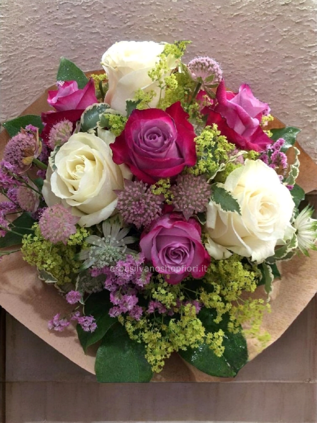 Bouquet con rose rosa, bianche, fiori misti e verdi.